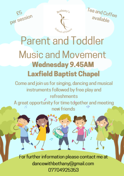 Music and Movement for parents and under 5’s is held every Wednesday Morning, 9.45am during term time.